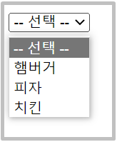 <option> 태그 안에 selected 속성을 붙이면 목록을 펼치기 전 '-- 선택 --' 항목이 보이도록 설정할 수 있다.