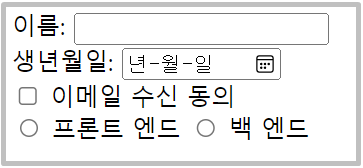 그래서 차이가 눈으로 보이지는 않지만 입력창이 아닌 텍스트(이름: )에 커서를 갖다대어 클릭하게 되면 입력창에 커서가 생성되어 편의성을 준다. 특히 checkbox나 radio를 사용할 때 텍스트만 클릭해도 선택이 되어 편리하다.