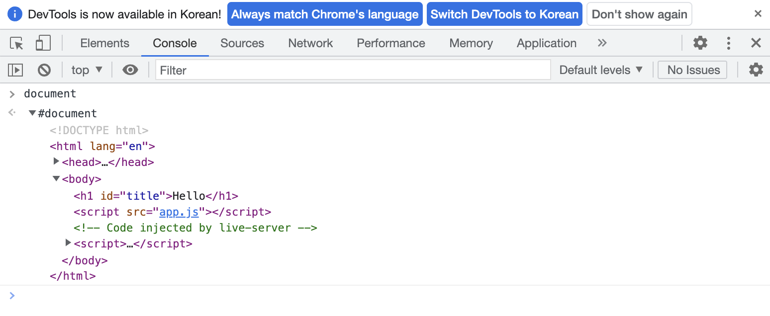 개발자 도구에서 console창을 열고 console창에 document를 입력하면 전체 HTML을 보여준다.
